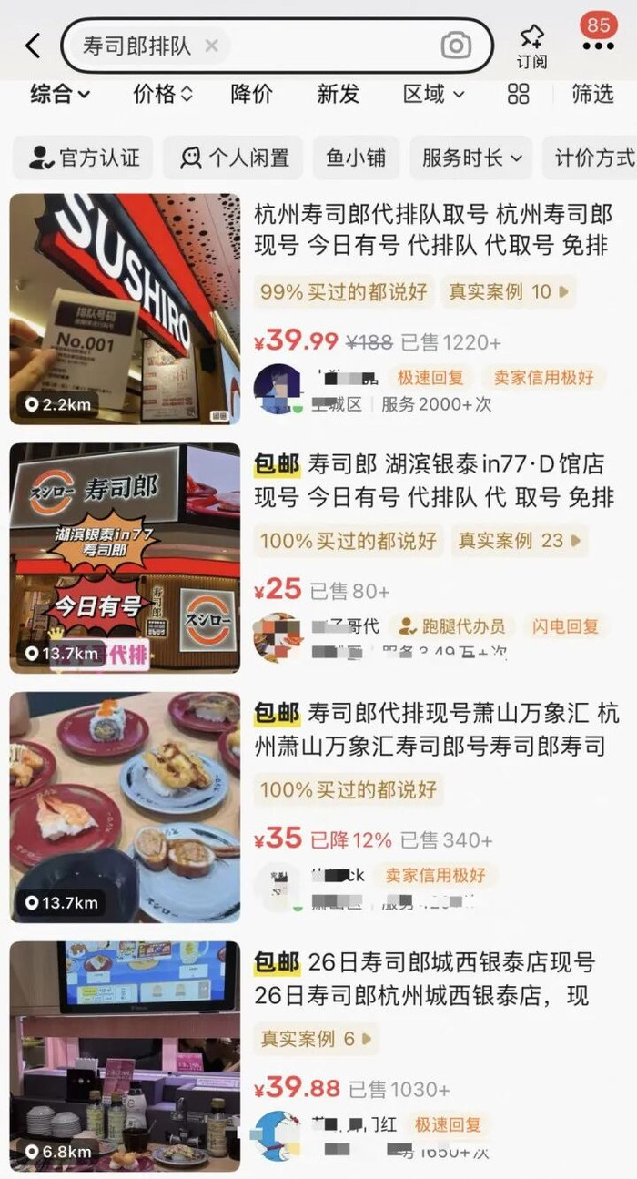 此前报道,记者检索发现,二手交易平台上寿司郎“代排队”价格普遍在30元-50元不等,有些价格甚至达到150元-300元。买家只需向卖家发送店名、预计到达时间及用餐人数等信息,不少卖家声称“保证能进,到店后可以马上入座”。