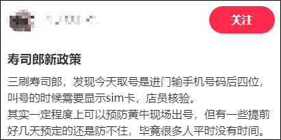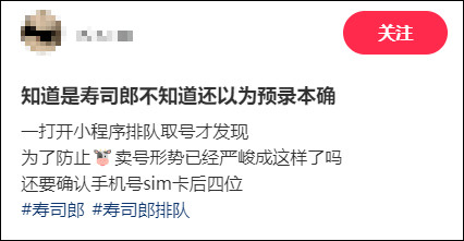 近日,有网友发文称,在寿司郎小程序预约取号后,到店签到需要核验手机尾号后4位,并出示手机SIM卡尾号。