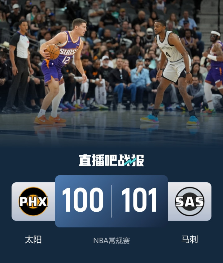 比赛开场,马刺率先发力,文班在攻防两端展现影响力,帮助球队建立领先,文班下场后太阳开始蚕食分差并完成反超,首节结束太阳26-24领先。次节回来,太阳延续势头,一度领先到两位数,此后两队交替取分,分差在5分上下浮动,半场结束太阳59-52领先。易边再战,两队依旧是拉锯战,马刺一度完成反超但很快又陷入得分荒再次被拉开,三节结束太阳79-73保持领先。末节回来,福克斯找到手感,联手文班率领马刺开始追分,最后文班完成绝杀,马刺险胜太阳。